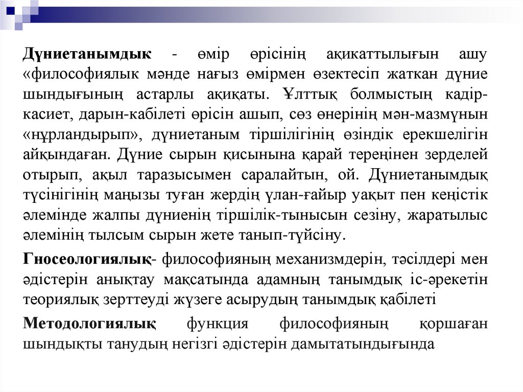 3. Дүниегекөзқарас (дүниетаным) – объективтік дүниеге, болмысқа, адамға және тіршілікке деген неғұрлым жинақталған, қорытылған