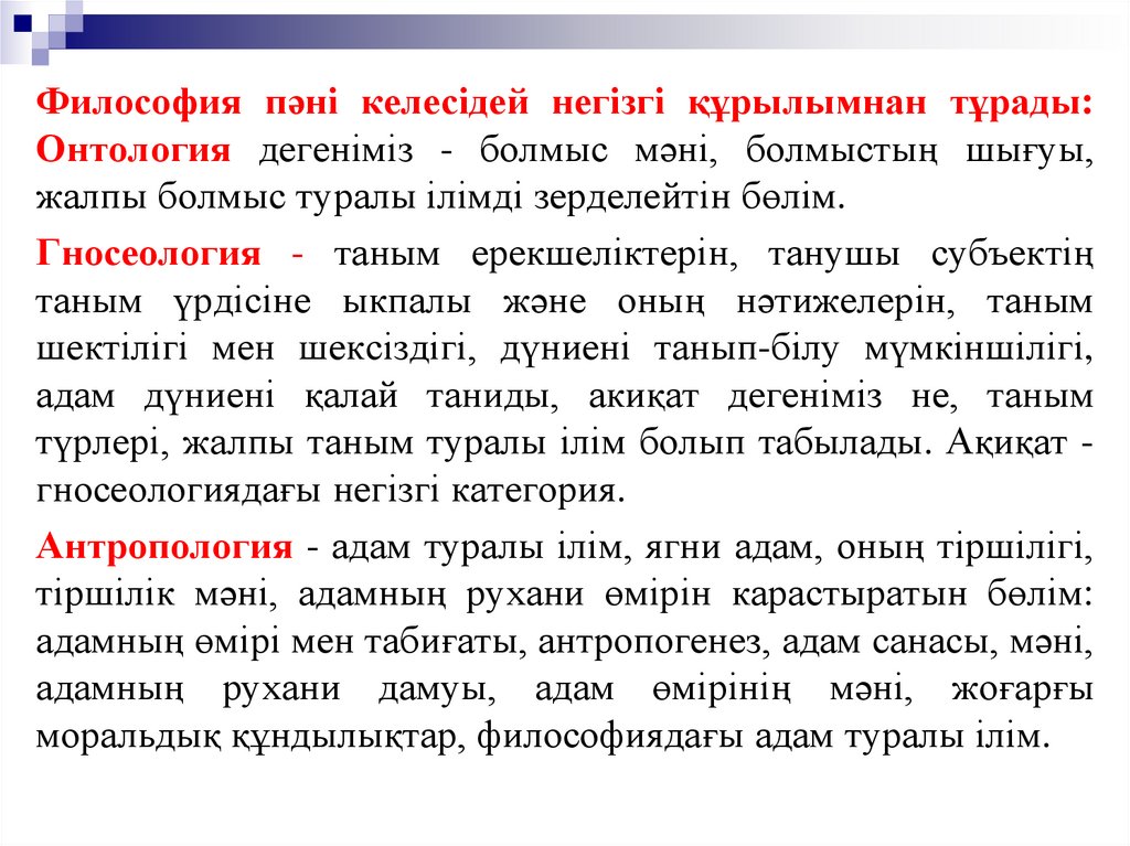 Философия пәні келесідей негізгі құрылымнан тұрады:Онтология дегеніміз - болмыс мәні, болмыстың шығуы,
