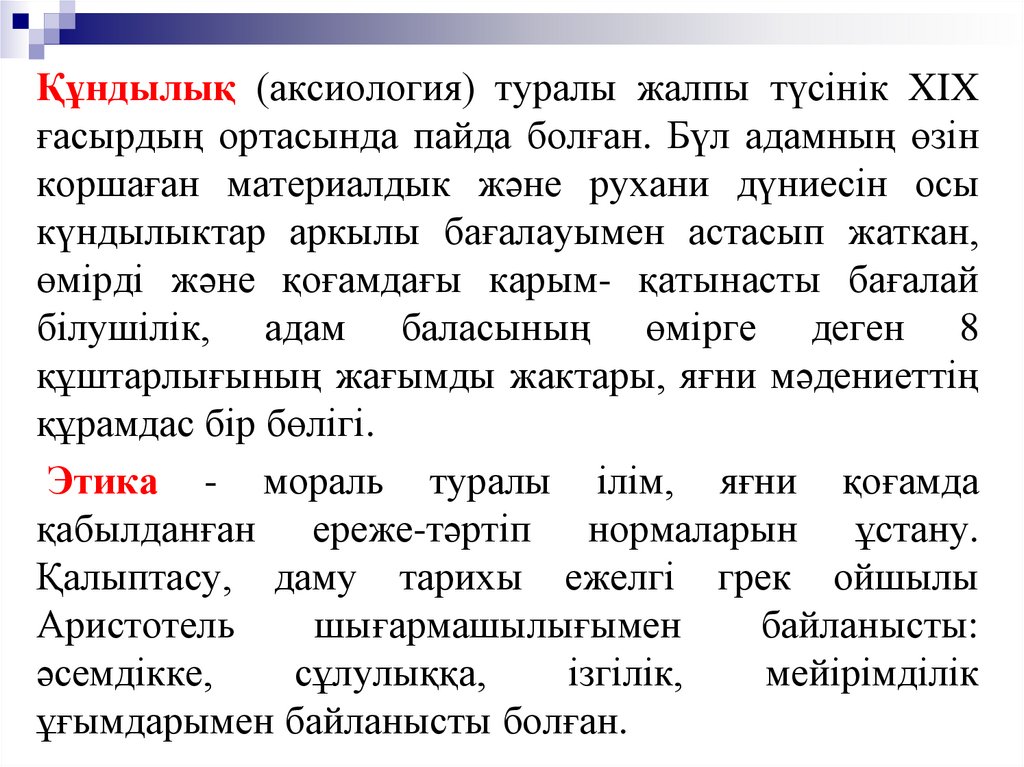 Құндылық (аксиология) туралы жалпы түсінік XIXғасырдың ортасында пайда болған. Бүл адамның өзін