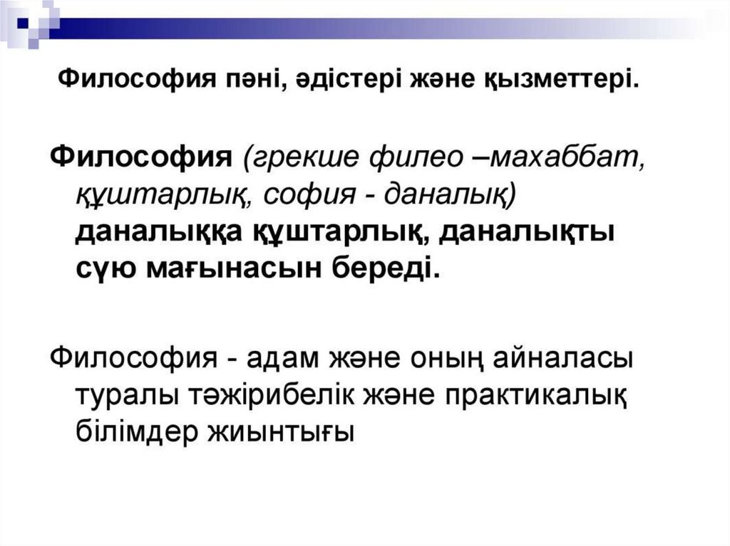 Философия (грекше phileo –махаббат,құштарлық, sophia - даналық)