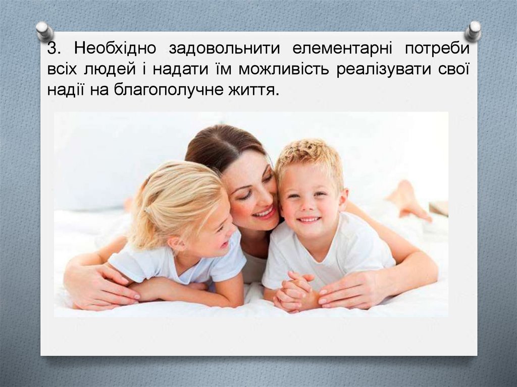 3. Необхідно задовольнити елементарні потребивсіх людей і надати їм можливість реалізувати свої
