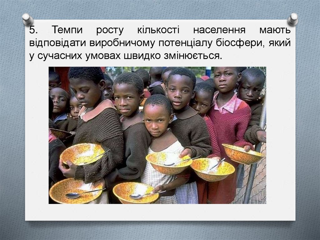 5. Темпи росту кількості населення маютьвідповідати виробничому потенціалу біосфери, який