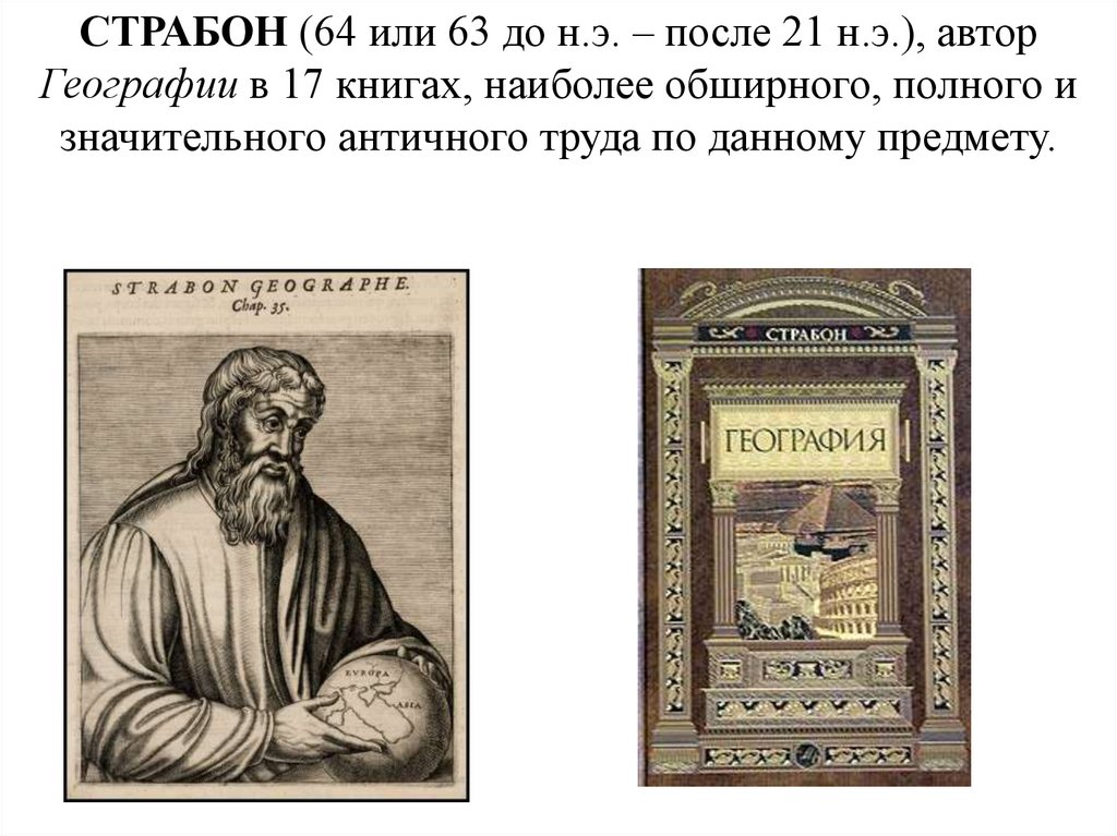 СТРАБОН (64 или 63 до н.э. – после 21 н.э.), авторГеографии в 17 книгах, наиболее обширного, полного и