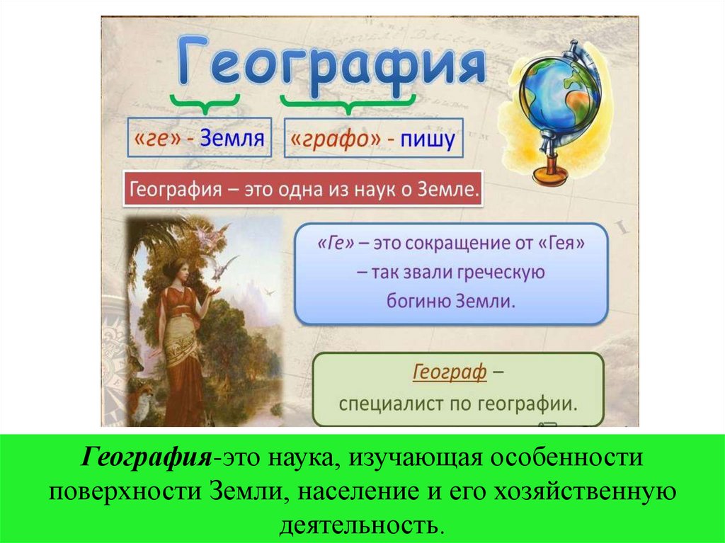 География-это наука, изучающая особенностиповерхности Земли, население и его хозяйственную