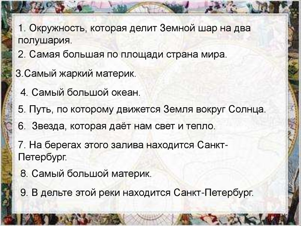 10. Экватор Россия Африка Тихий Орбита Солнце Финский Евразия Нева