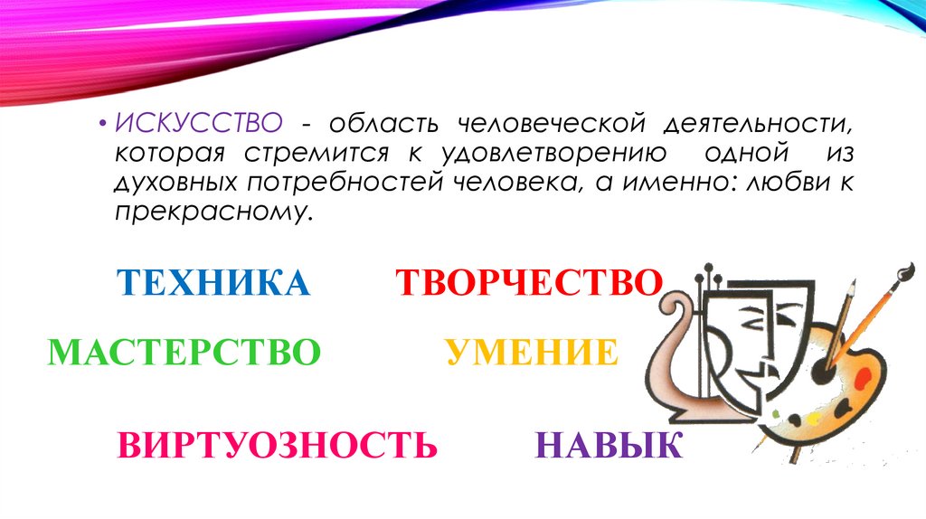 • ИСКУССТВО - область человеческой деятельности,которая стремится к удовлетворению одной из