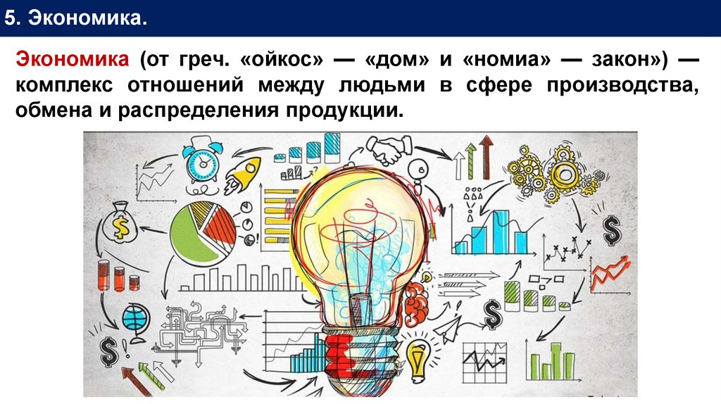 5. Экономика.Экономика (от греч. «ойкос» — «дом» и «номиа» — закон») —