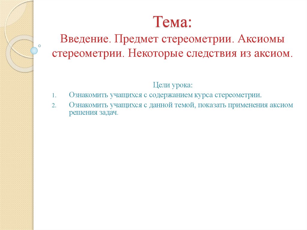 Ознакомить учащихся с данной темой, показать применения аксиом