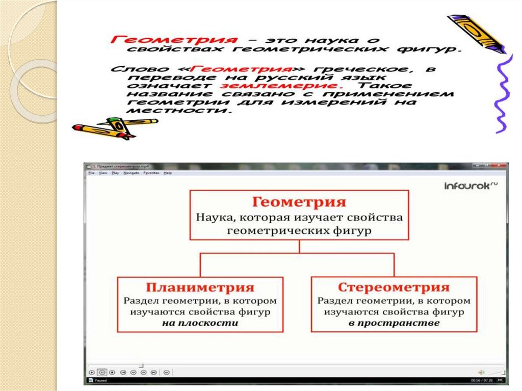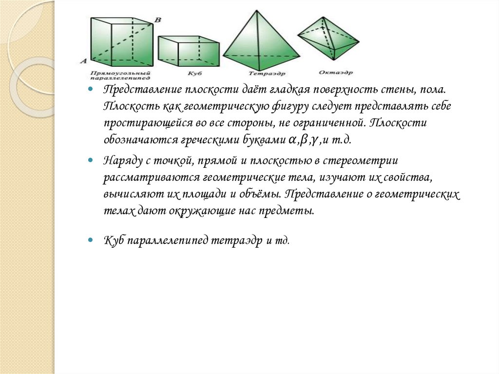 Представление плоскости даёт гладкая поверхность стены, пола.Плоскость как геометрическую фигуру следует представлять себе