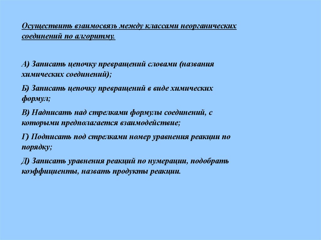 Осуществить взаимосвязь между классами неорганическихсоединений по алгоритму.