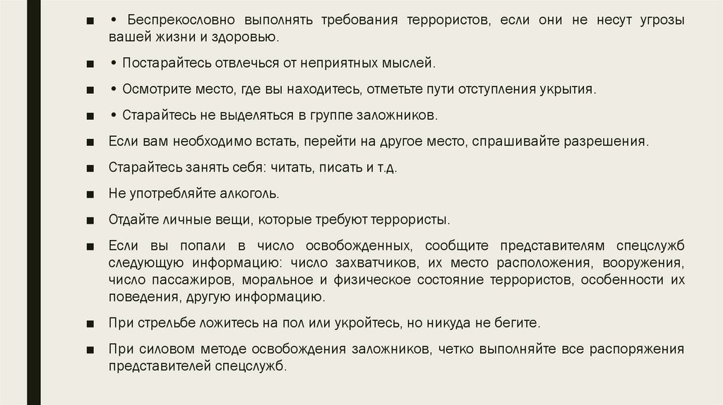 ■ • Беспрекословно выполнять требования террористов, если они не несут угрозывашей жизни и здоровью.