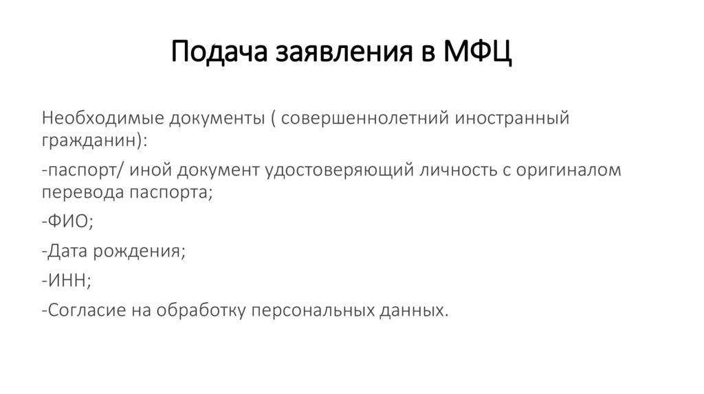Подача заявления в МФЦНеобходимые документы ( совершеннолетний иностранный