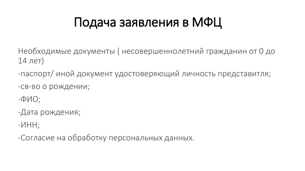Подача заявления в МФЦНеобходимые документы ( несовершеннолетний гражданин от 0 до
