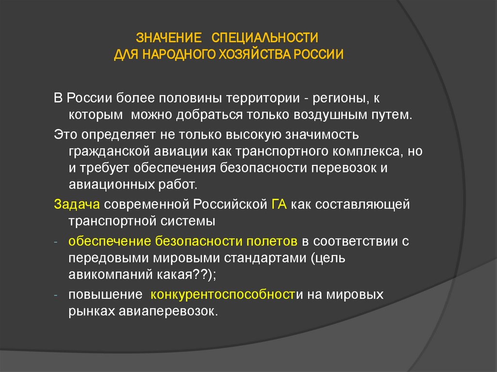 ЗНАЧЕНИЕ СПЕЦИАЛЬНОСТИДЛЯ НАРОДНОГО ХОЗЯЙСТВА РОССИИ