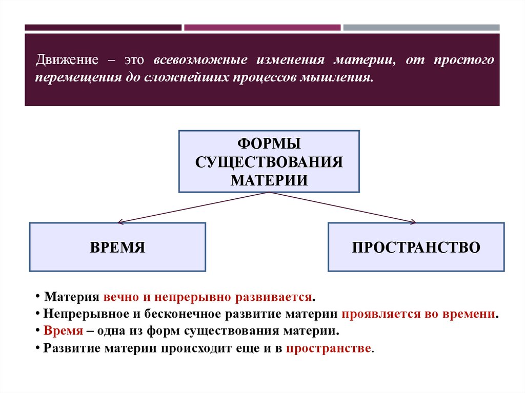 Движение – это всевозможные изменения материи, от простогоперемещения до сложнейших процессов мышления.