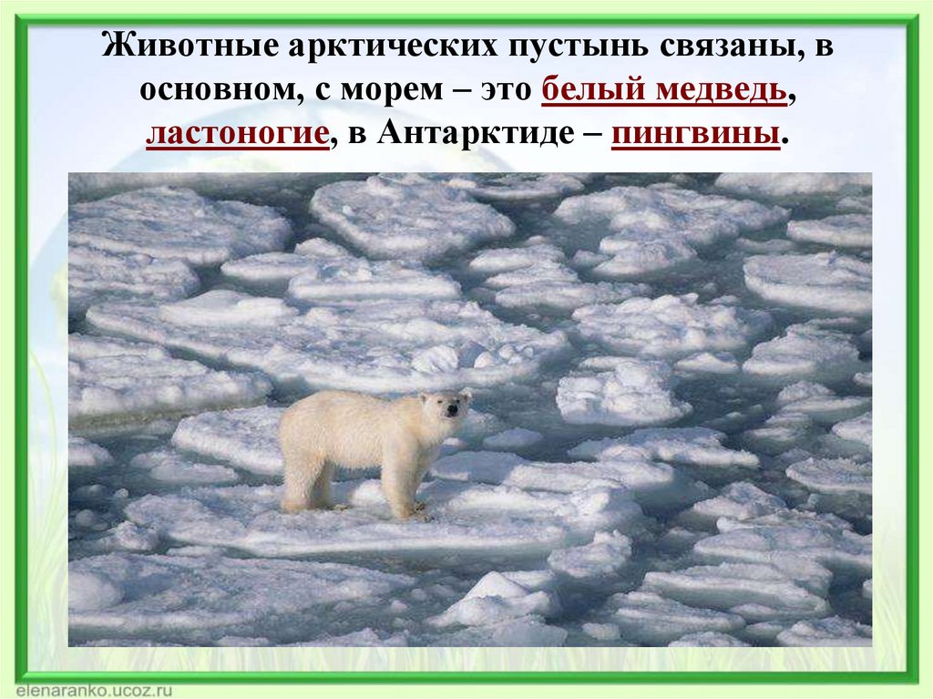Животные арктических пустынь связаны, восновном, с морем – это белый медведь,