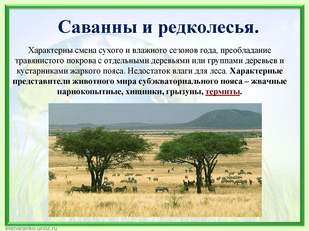 Саванны и редколесья.Характерны смена сухого и влажного сезонов года, преобладание