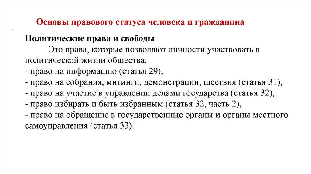 - право на собрания, митинги, демонстрации, шествия (статья 31),