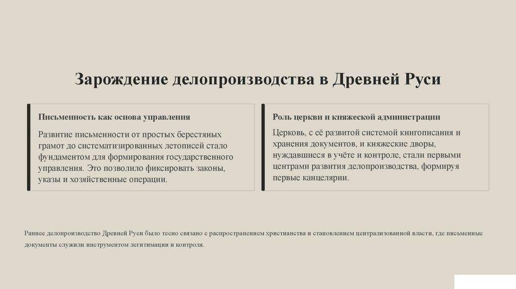 Раннее делопроизводство Древней Руси было тесно связано с распространением христианства и становлением централизованной власти, где письменные