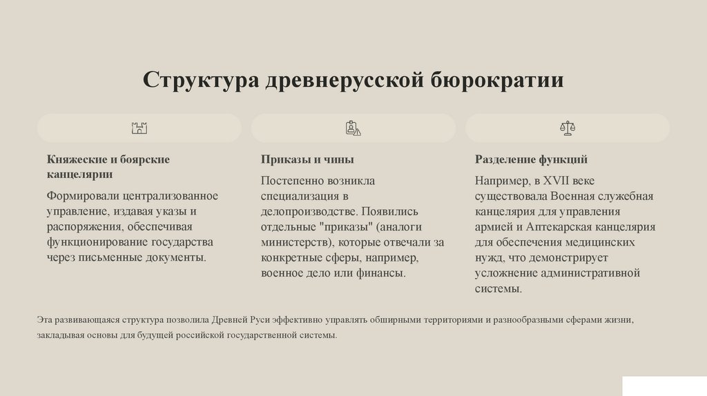 Эта развивающаяся структура позволила Древней Руси эффективно управлять обширными территориями и разнообразными сферами жизни,