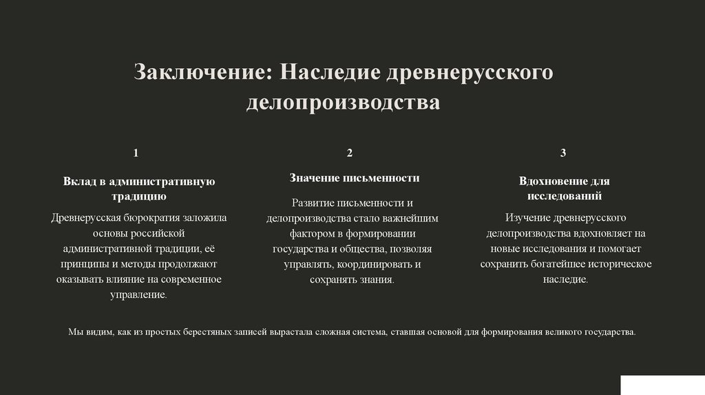Мы видим, как из простых берестяных записей вырастала сложная система, ставшая основой для формирования великого государства.