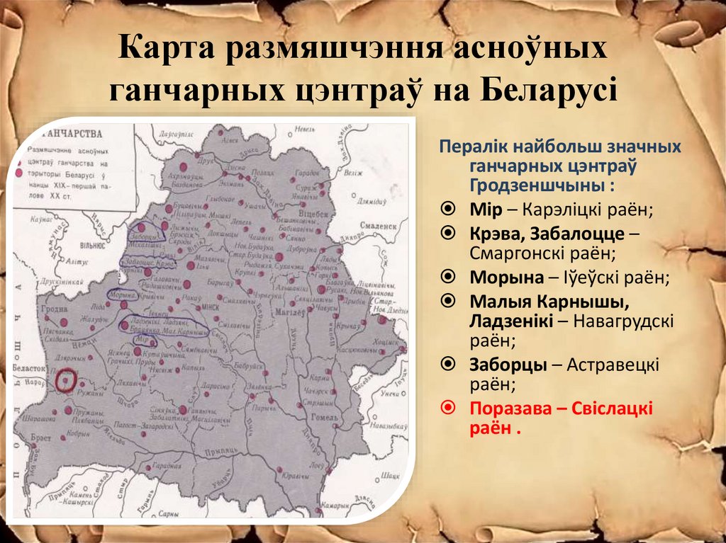 Карта размяшчэння асноўныхганчарных цэнтраў на Беларусі