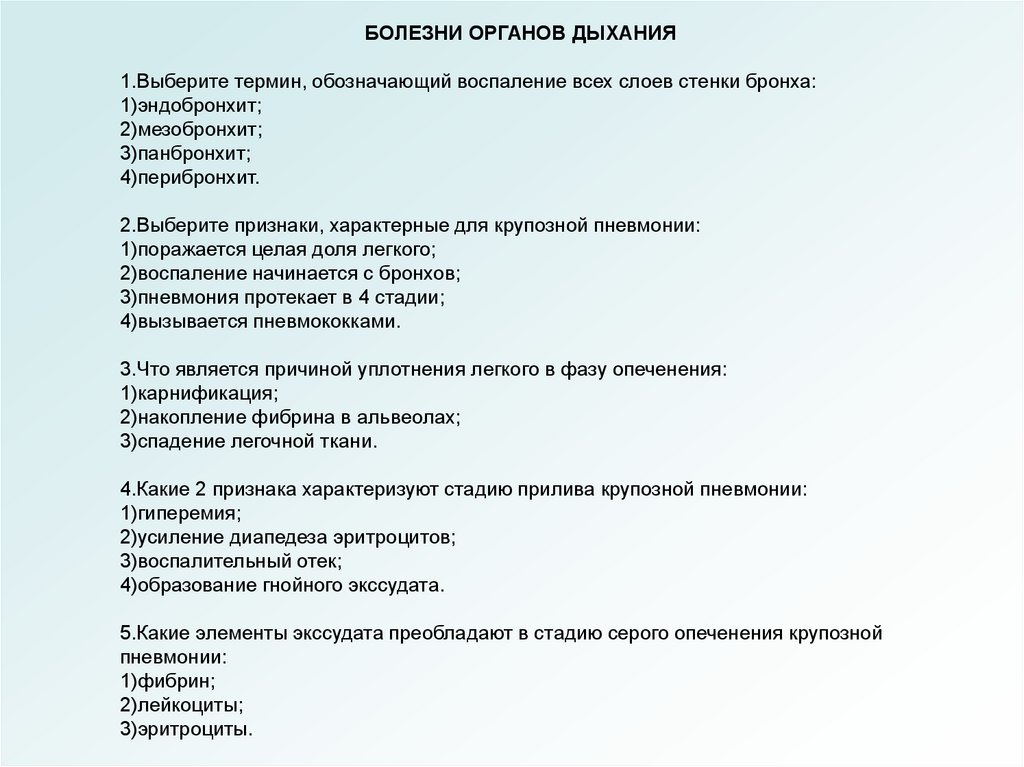 БОЛЕЗНИ ОРГАНОВ ДЫХАНИЯ1.Выберите термин, обозначающий воспаление всех слоев стенки бронха: