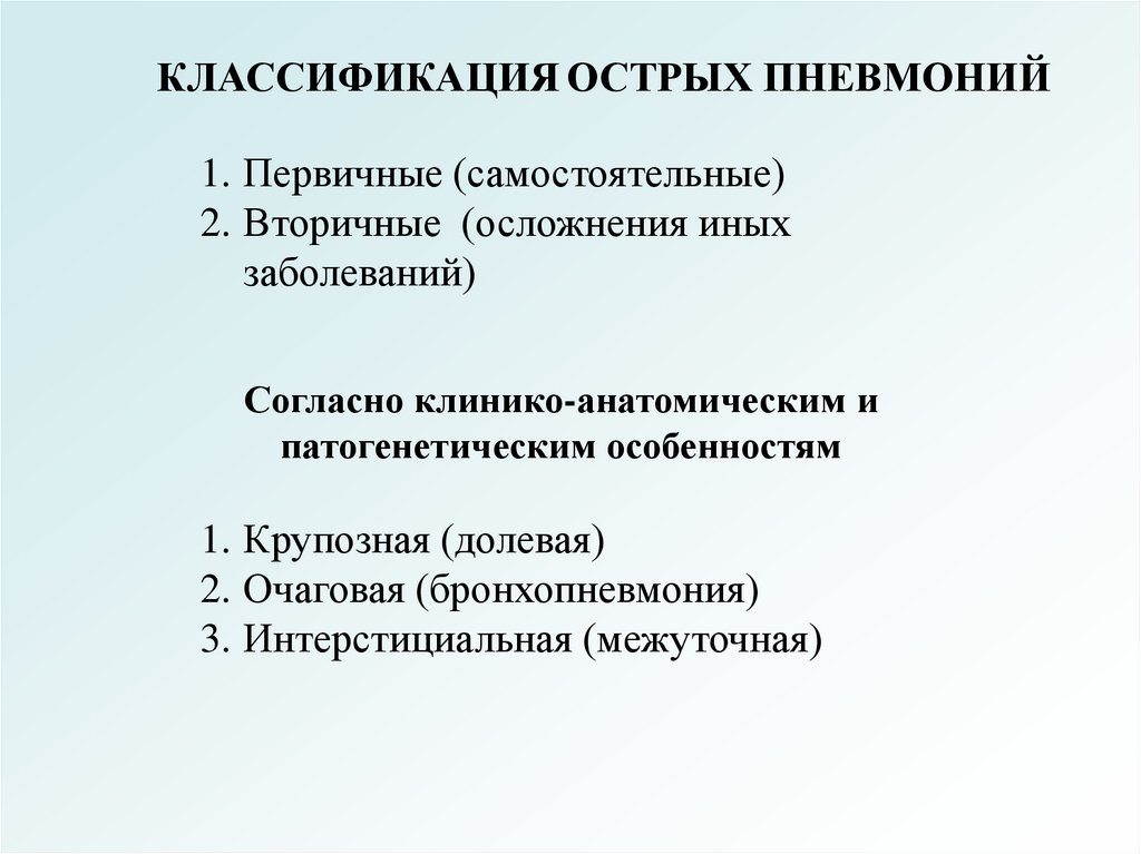 КЛАССИФИКАЦИЯ ОСТРЫХ ПНЕВМОНИЙ1. Первичные (самостоятельные)