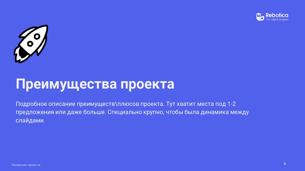 Преимущества проектаПодробное описание преимуществ\плюсов проекта. Тут хватит места под 1-2