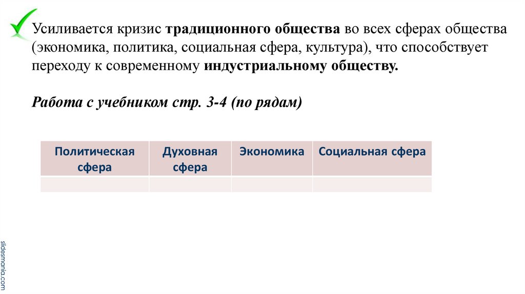 Усиливается кризис традиционного общества во всех сферах общества(экономика, политика, социальная сфера, культура), что способствует