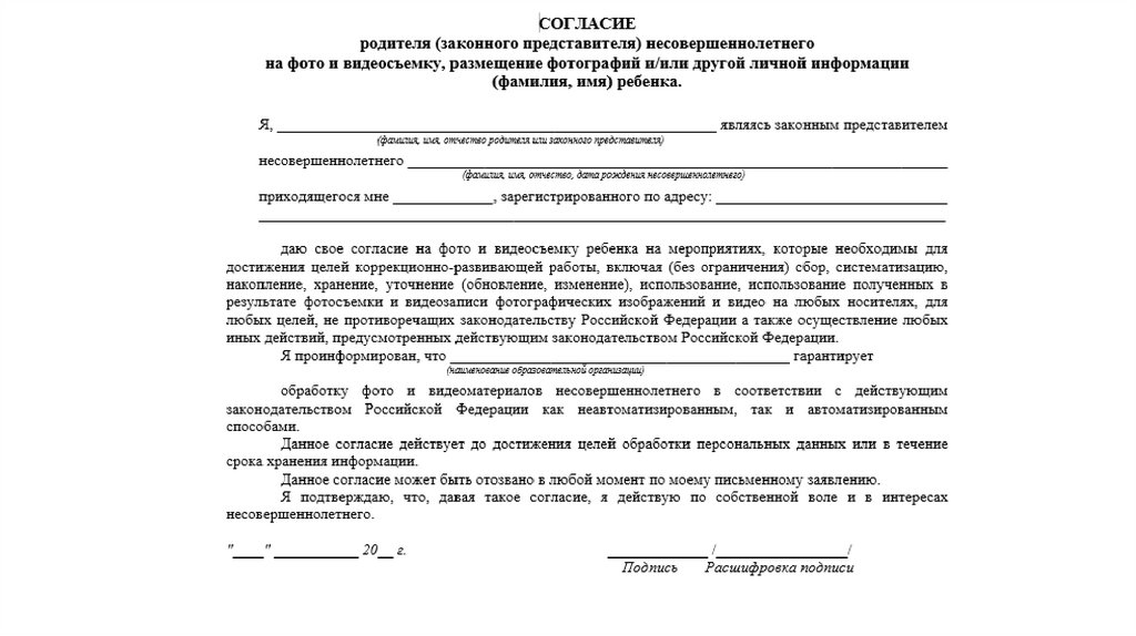 Согласие родителя (законного представителя) несовершеннолетнего на фото и видеосъемку, размещение фотографий