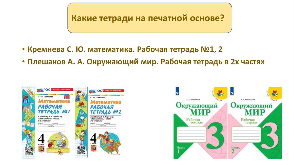Какие тетради на печатной основе?• Кремнева С. Ю. математика. Рабочая тетрадь №1, 2