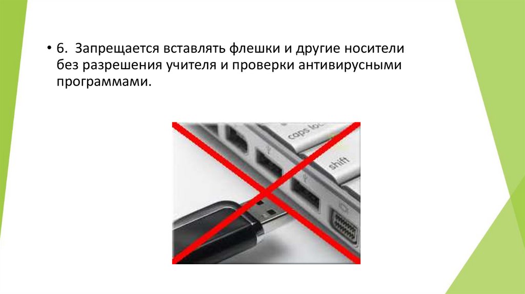 • 6. Запрещается вставлять флешки и другие носителибез разрешения учителя и проверки антивирусными