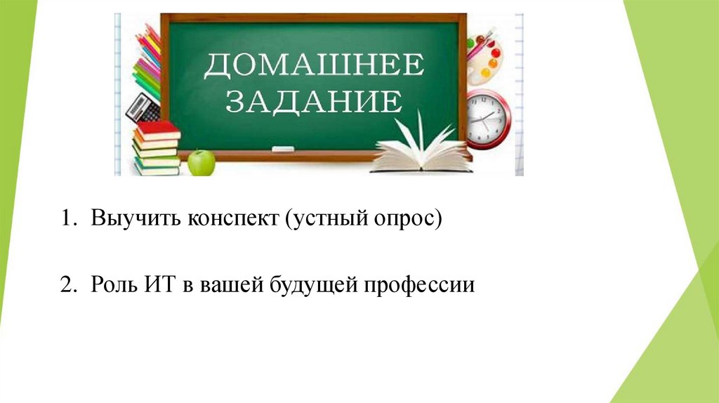 1. Выучить конспект (устный опрос)2. Роль ИТ в вашей будущей профессии
