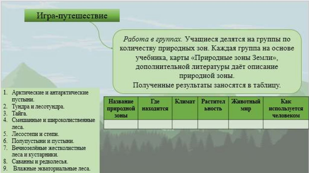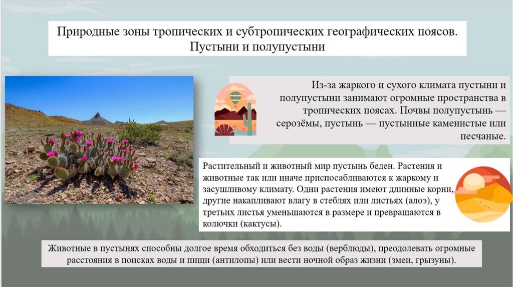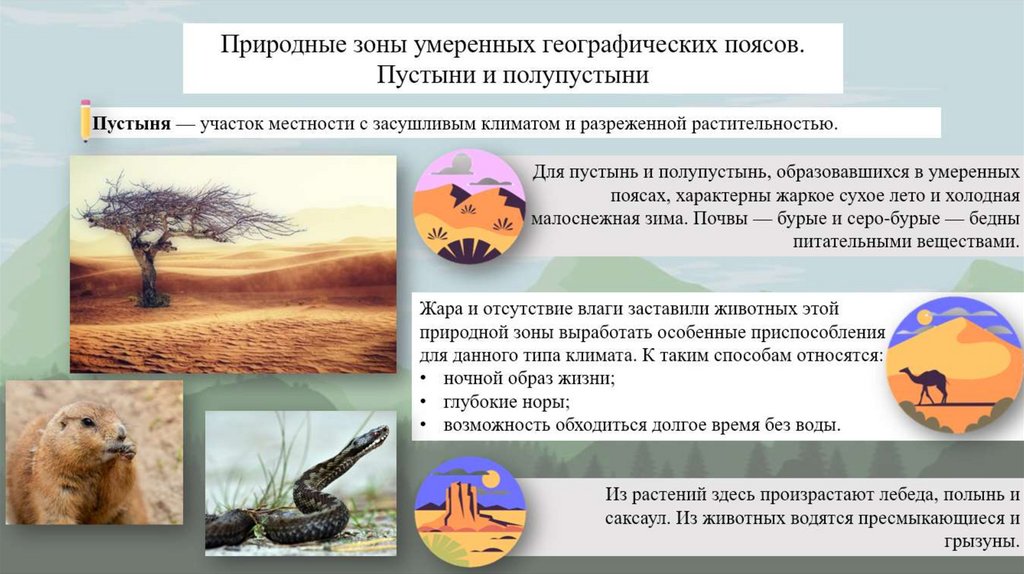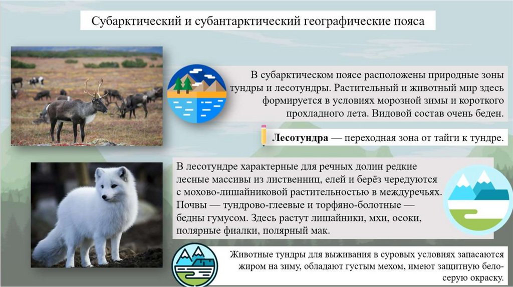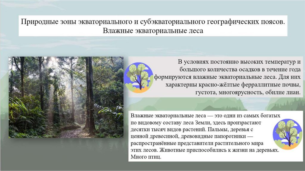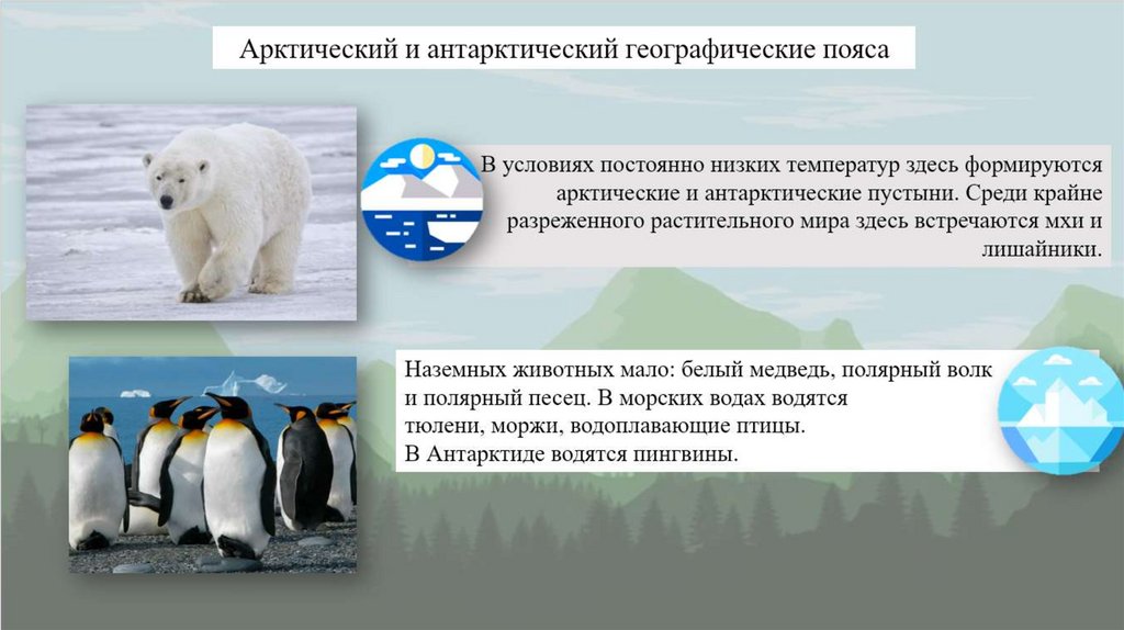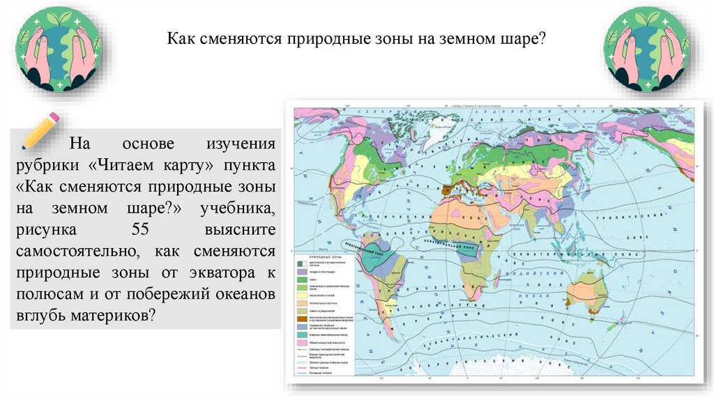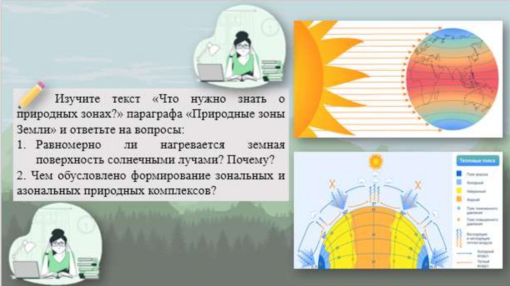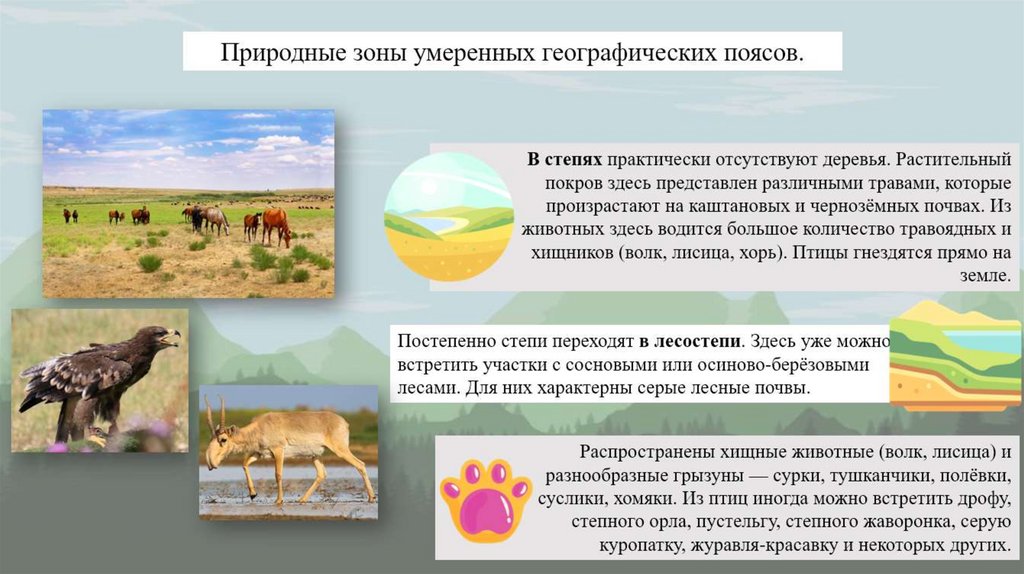 Природные зоны — территории с близкими условиями температур и увлажнения,схожими почвами, растительностью и животным миром.