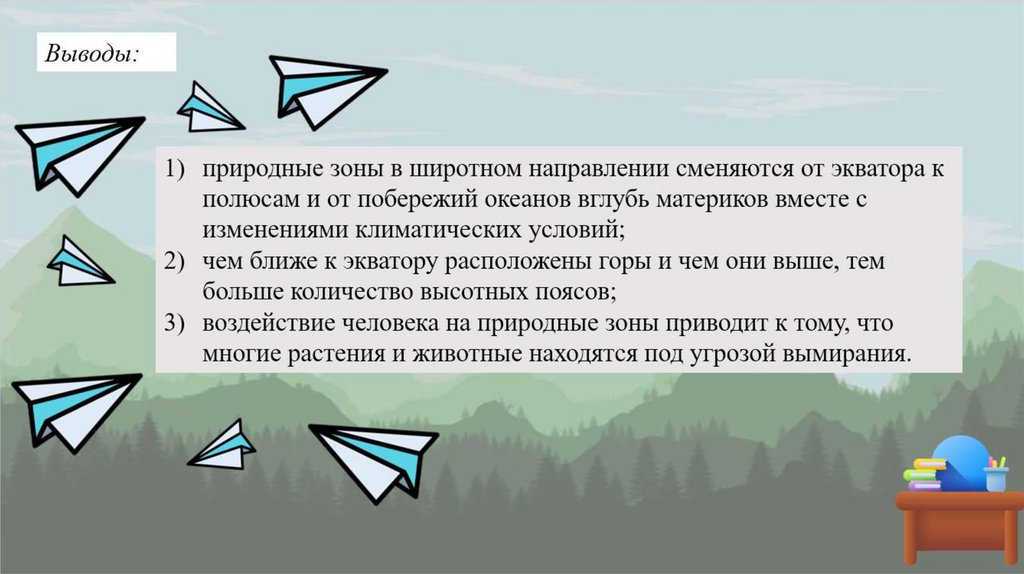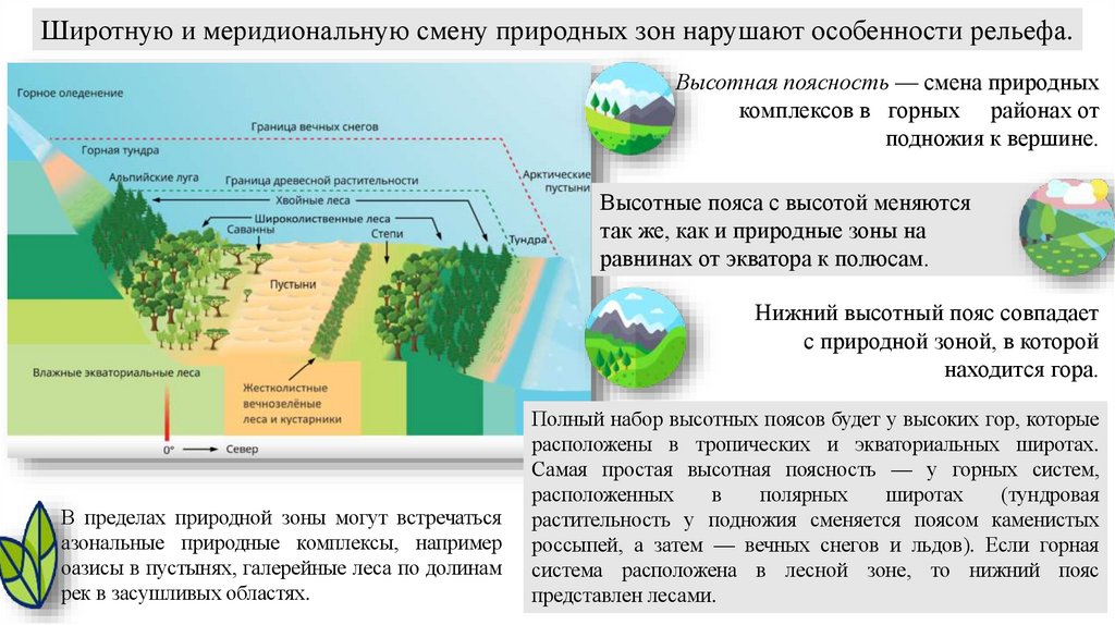 Широтную и меридиональную смену природных зон нарушают особенности рельефа.Высотная поясность — смена природных