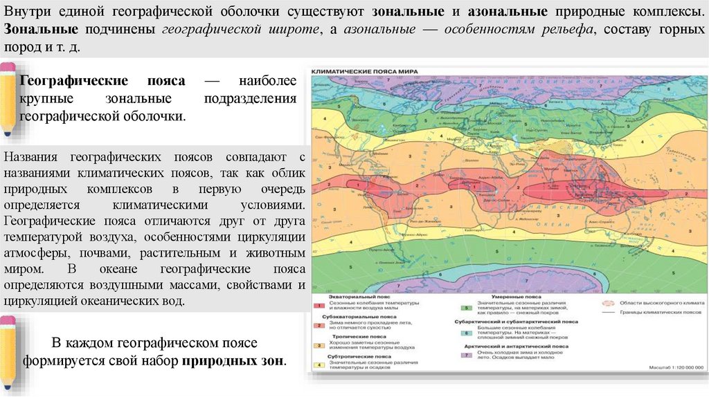 Внутри единой географической оболочки существуют зональные и азональные природные комплексы.Зональные подчинены географической широте, а азональные — особенностям рельефа, составу горных