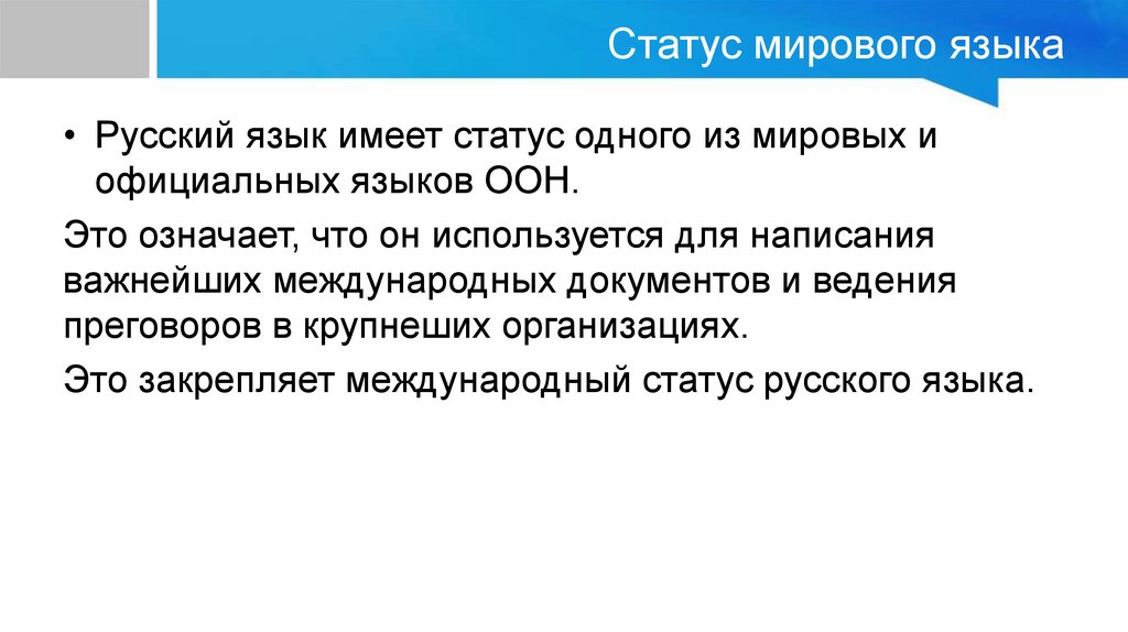 Статус мирового языка• Русский язык имеет статус одного из мировых и