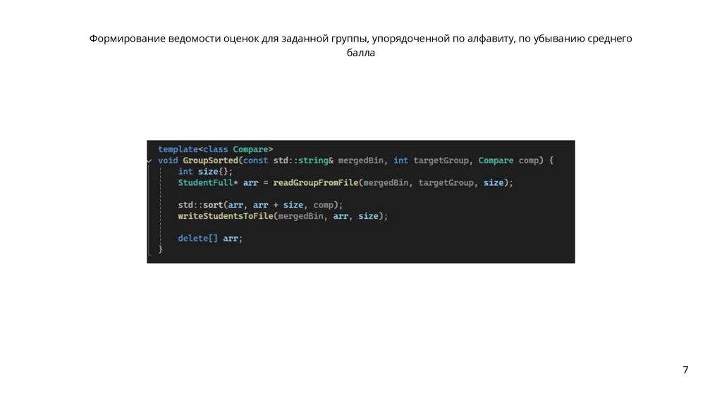 Формирование ведомости оценок для заданной группы, упорядоченной по алфавиту, по убыванию среднегобалла