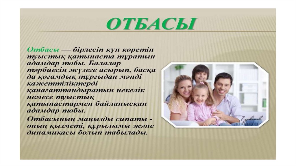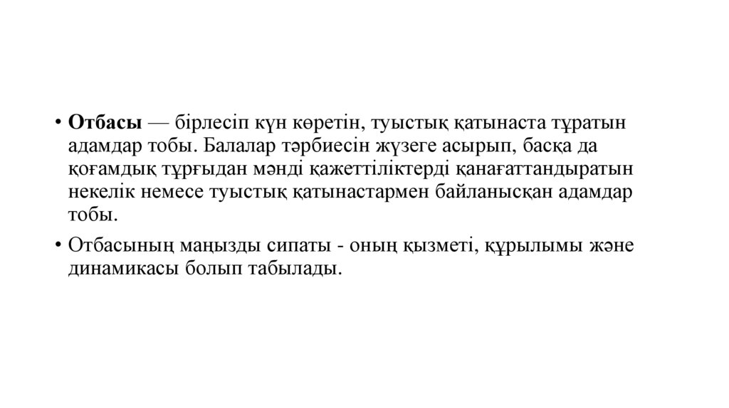 • Отбасы — бірлесіп күн көретін, туыстық қатынаста тұратынадамдар тобы. Балалар тәрбиесін жүзеге асырып, басқа да