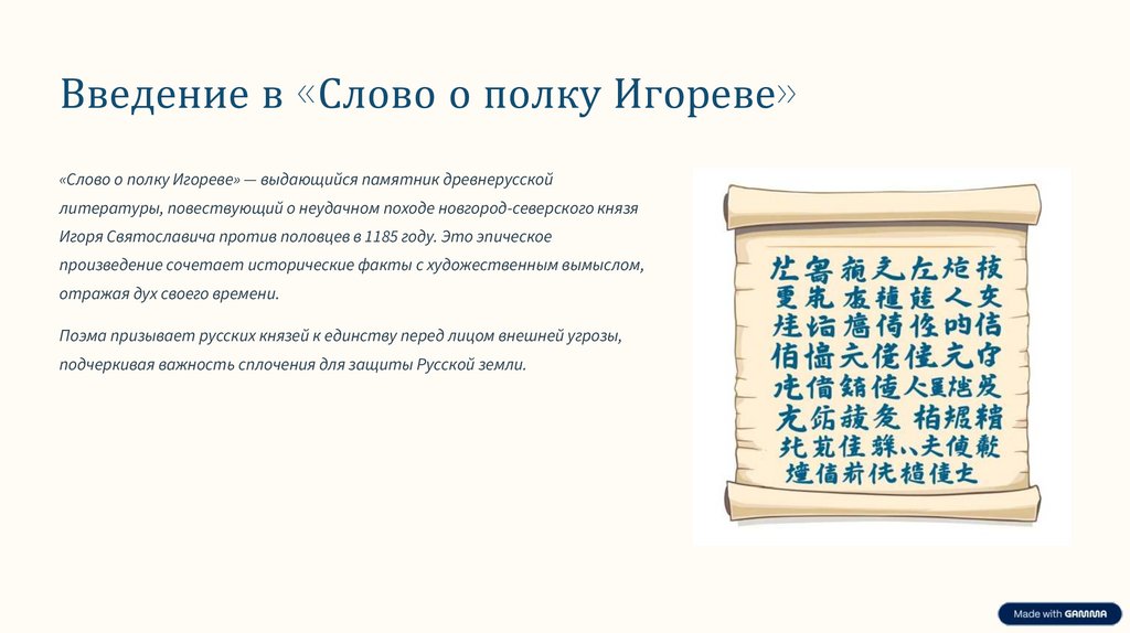 Введение в «Слово о полку Игореве»«Слово о полку Игореве» — выдающийся памятник древнерусской