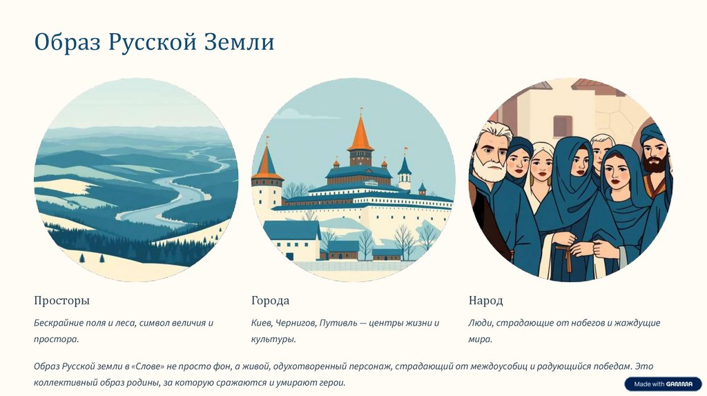 Образ Русской земли в «Слове» не просто фон, а живой, одухотворенный персонаж, страдающий от междоусобиц и радующийся победам. Это