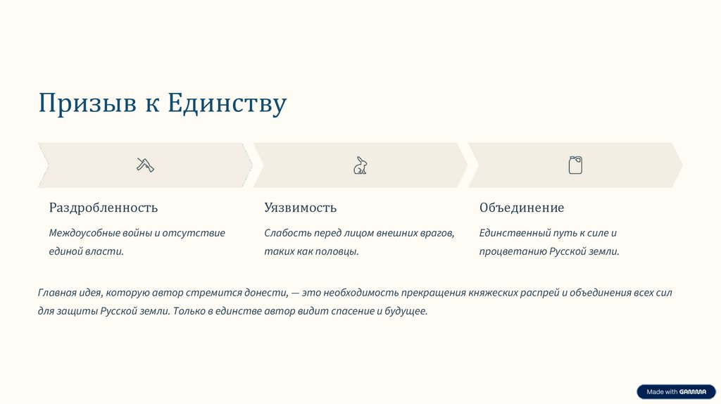 Поэма призывает русских князей к единству перед лицом внешней угрозы,