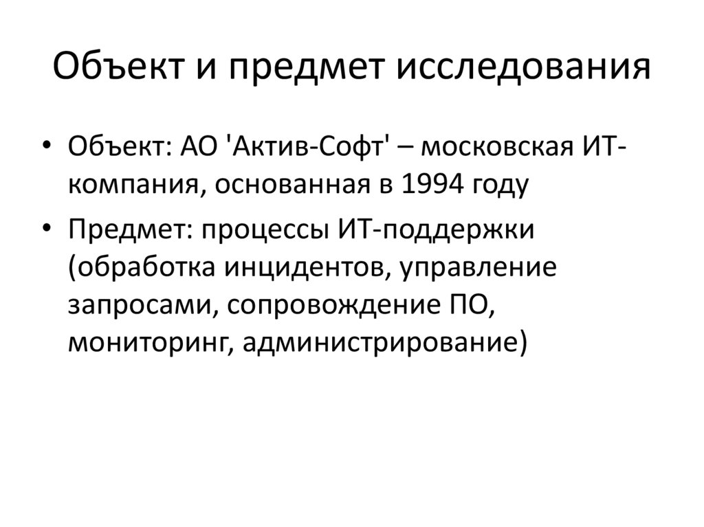 Объект и предмет исследования• Объект: АО 'Актив-Софт' – московская ИТкомпания, основанная в 1994 году