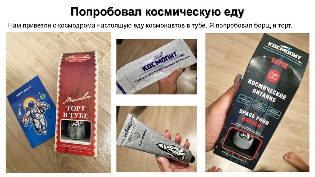 Попробовал космическую едуНам привезли с космодрома настоящую еду космонавтов в тубе. Я попробовал борщ и торт.
