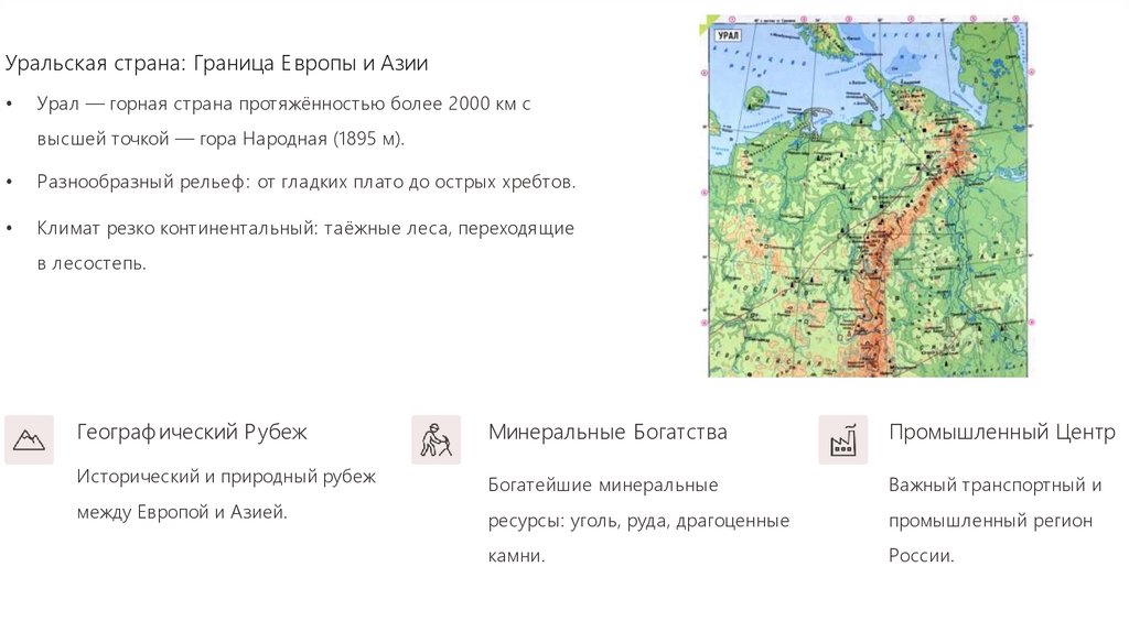 Уральская страна: Граница Е вропы и АзииУрал — горная страна протяжённостью более 2000 км с