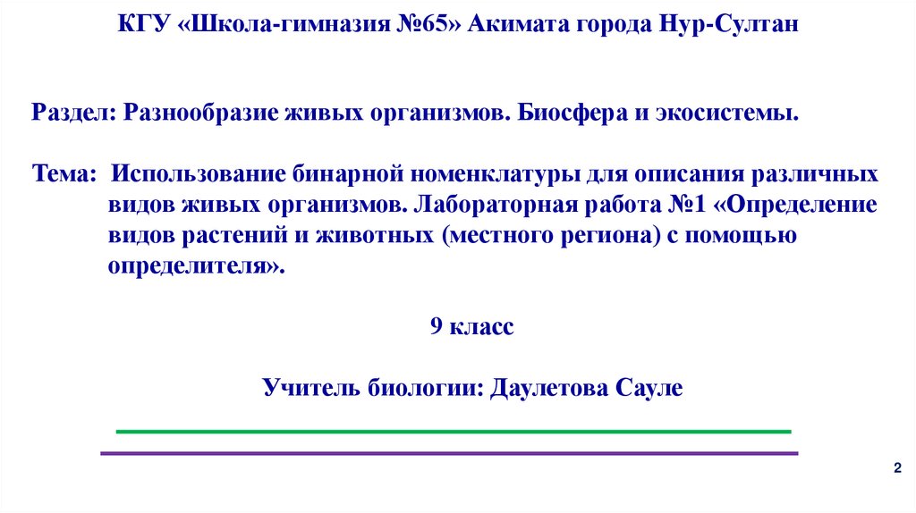 КГУ «Школа-гимназия №65» Акимата города Нур-СултанРаздел: Разнообразие живых организмов. Биосфера и экосистемы.