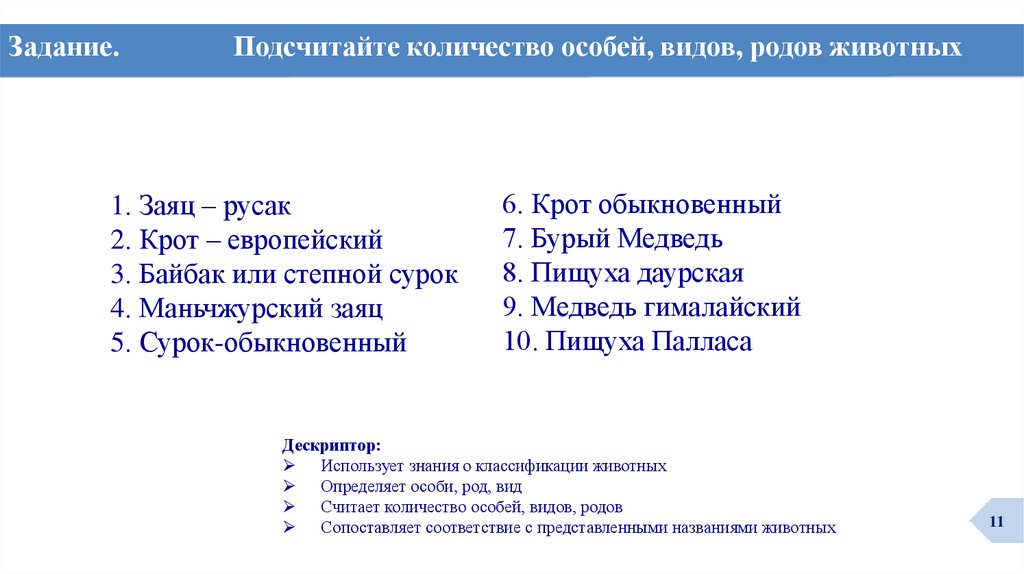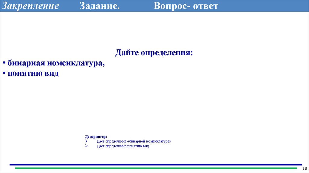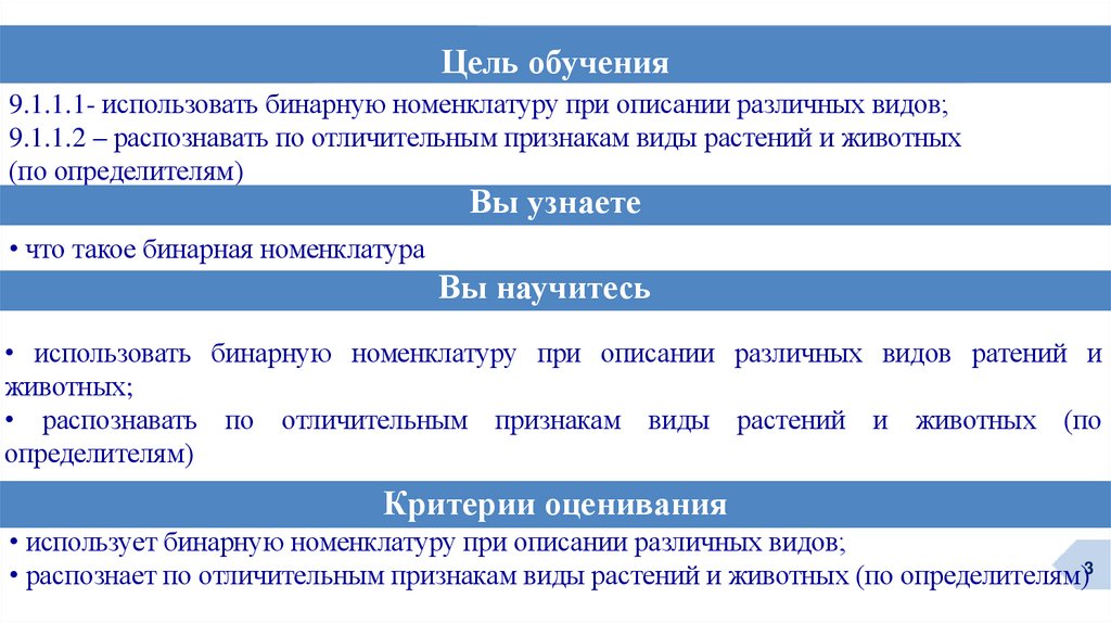 Цель обучения9.1.1.1- использовать бинарную номенклатуру при описании различных видов;