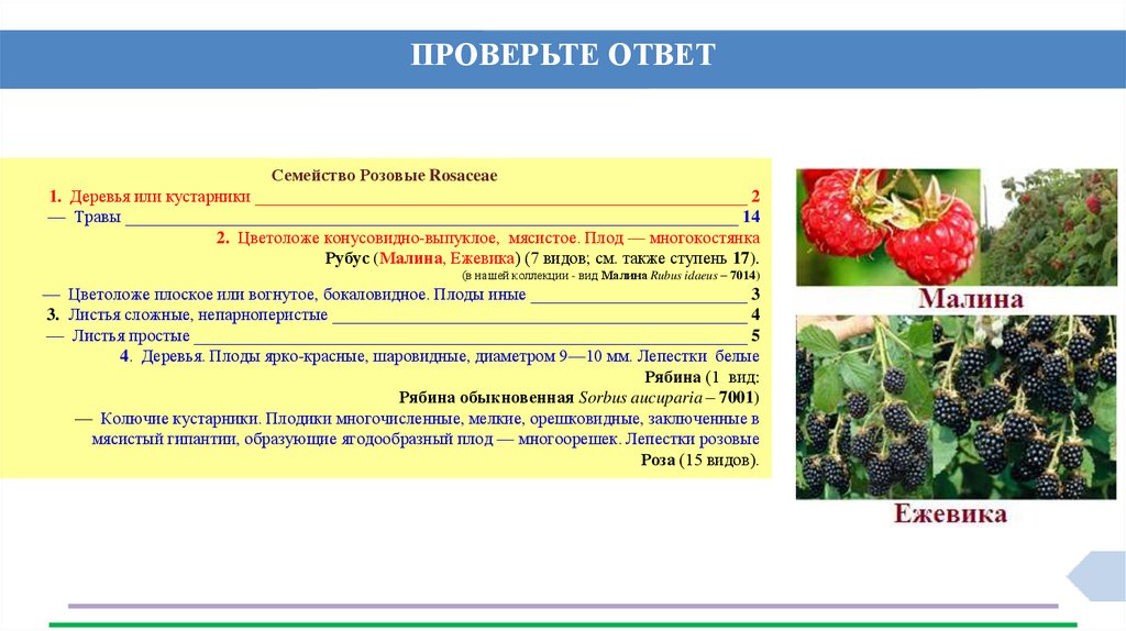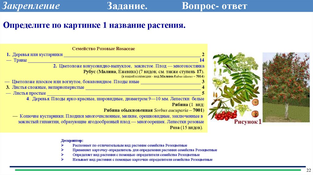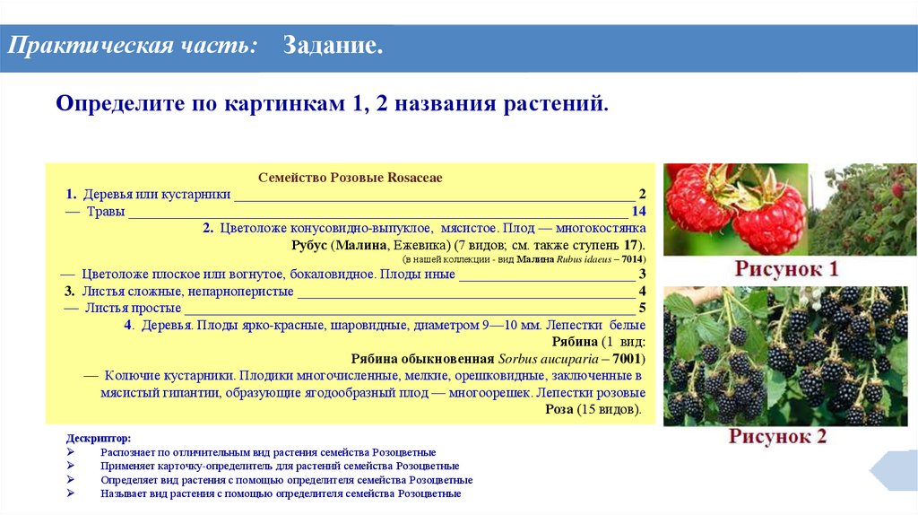 Применяет карточку-определитель для определения растения семейства Розоцветные