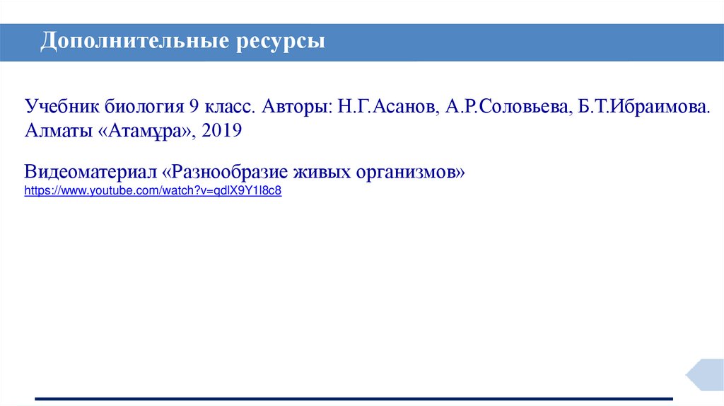 Дополнительные ресурсыУчебник биология 9 класс. Авторы: Н.Г.Асанов, А.Р.Соловьева, Б.Т.Ибраимова.